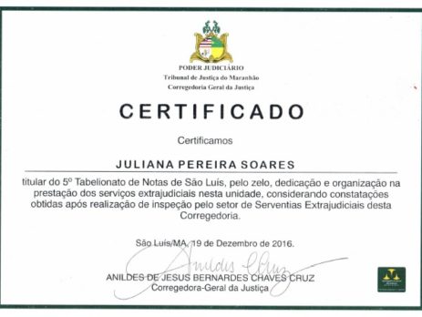 É muito gratificante receber o reconhecimento da Corregedoria Geral da Justiça do TJMA pelos serviços prestados no 5º Tabelionato de Notas de São Luís. Agradeço à minha equipe de colaboradores, sempre empenhada e comprometida com o trabalho desenvolvido. Sem vocês isso não seria possível. Obrigada!!!